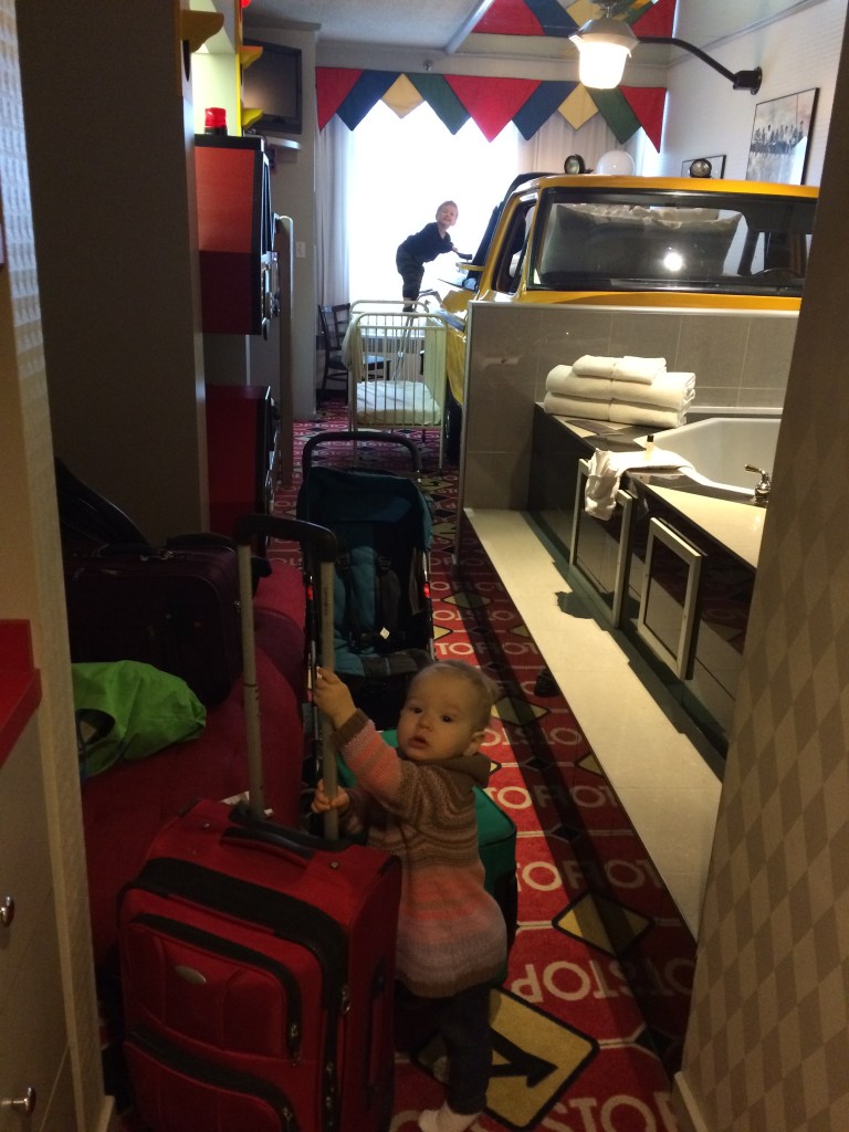 The Fantasyland Hotel is inside the mall so we could walk everywhere. The only time I went outside was to sneak a cigarette after a few glasses of wine. I had used airmiles for our flights, so we splurged on the truck themed room. The queen bed is in the back of a pickup and there is a set of bunk beds that look like a fire engine. Décor is antique gas pumps and traffic lights. You can climb in the cab of the truck. I put in a request for a crib for Katie which was there on arrival but left extraordinarily little room for anything else. Everyone loved the room.