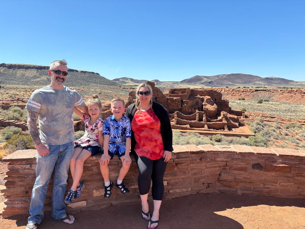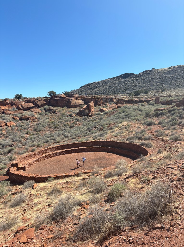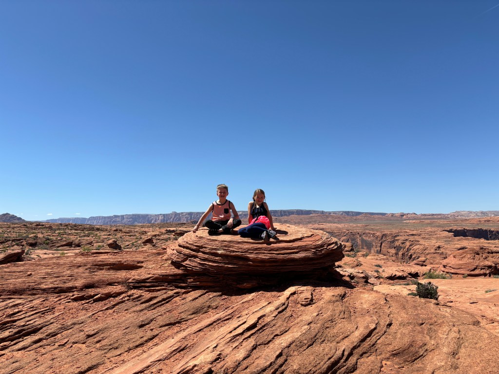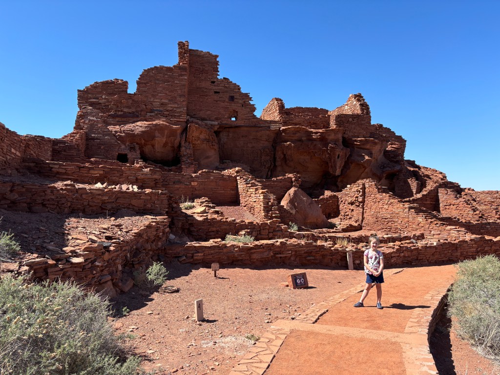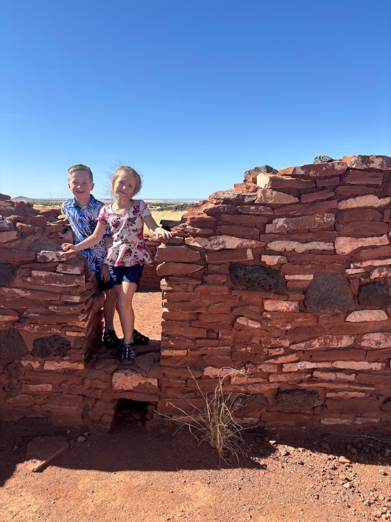 The next stop was Page so we got in the rental car and drove North. We stopped at the Wupatki Monument on the way. This Hopi community bordering the Navajo Nation dates back to the 1100s. There’s evidence people have lived in this area since 500 BCE. We checked out the ancient trade center, citadel, ballcourt and smaller family structures at various rest areas. This was a great way to break up our day of driving. We spent a couple of hours wandering the dirt paths. The kids had some new scenery to fight in. There was rocks to climb up and buildings to conquer.