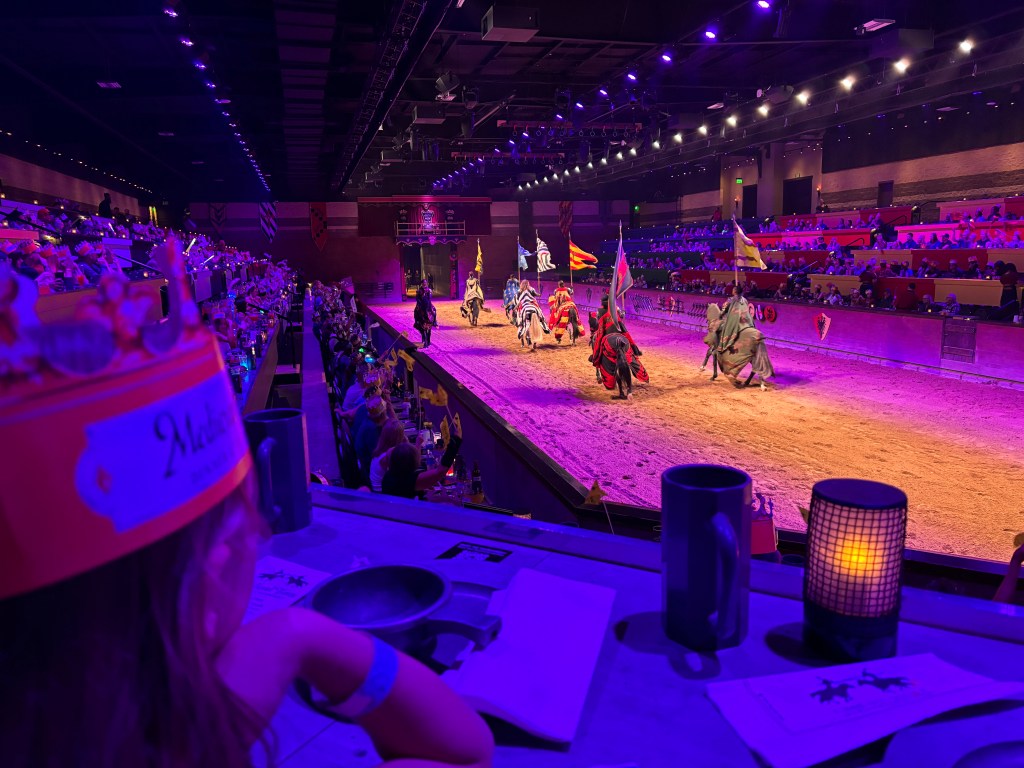 Our journey concluded with the final leg back to Pheonix for our flight home. We booked our last Arizona hurrah at the Medieval Times Dinner and Tournament in nearby Scottsdale. There was a promo code for $20 off each ticket which made this excursion fairly reasonable considering it included a four course feast (with no utensils of course). The rugrats were thrilled to eat half a chicken with their hands. I would have loved a fork and knife but went along with the gimmick. Pop was included. Wobbly pops and souvenir cups were outrageous. As were the souvenirs. The kids were warned (thank god) before we got there that was no whining for extras. The show was actually really good. The horsemanship was impressive and kept everyone’s attention. The knight’s battles and jesting tournament was great. Next time I’ll know to sneak drinks in.